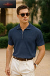 Description: A sophisticated and refined look for modern men, showcasing a stylish yet comfortable ensemble. The model wears a soft beige, ribbed zip-up polo shirt paired with crisp, white trousers, accessorized with a brown leather belt and watch. His stylish sunglasses complete the look, exuding an effortless charm that blends casual and formal elements seamlessly. Perfect for a relaxed yet fashionable outdoor outing or an elegant evening event.